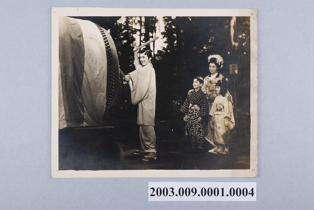 日本電影《豆狸忍術合戰》的橫式黑白劇照之一,正面為劇中在神社前若殿藤四郎(和田孝飾演)手執長棒拍打大鼓,白菊姬(筑紫明美飾演)帶著由狸化身的女童、男童一旁面帶微笑觀看的場景。而背面則另有「中一行影業部」、「豆狸忍術合戰」、「第 張」、「共計 張」等藍色蓋印字樣。