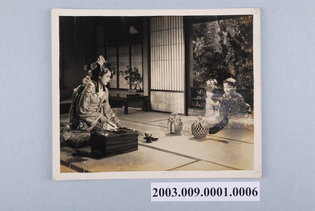 日本電影《豆狸忍術合戰》的橫式黑白劇照之一,正面為穿著和服的白菊姬(筑紫明美飾演)坐在圍棋前,由二隻狸化身為男童、女童隱現室內,相視而望的場景,而背面則另有「中一行影業部」、「豆狸忍術合戰」、「第 張」、「共計 張」等藍色蓋印字樣。