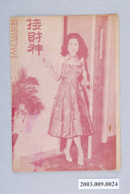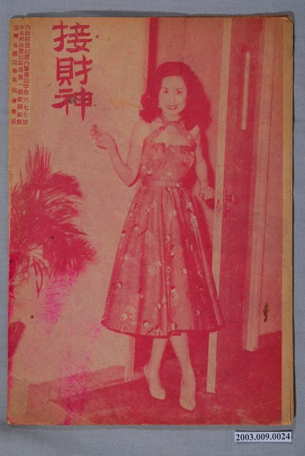 國語片《接財神》的電影特刊,印刷裝訂成冊,封面及封底均是女主角白光的劇照,內容包括《接財神》本事、劇照、歌譜、花絮,以及中藝影片公司出品、唐煌導演、王引及張仲文合演之《江湖恩仇》電影廣告等。