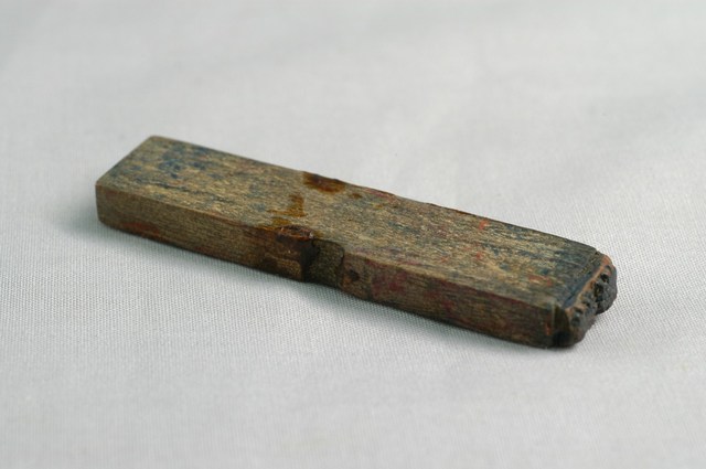 1.本物件為新竹國民戲院之印章,長方體狀,木製材質。該印章刻有「業務」字樣,字體模糊不清,雕刻方式為陽刻,底部橡膠為橘色,有使用痕跡。