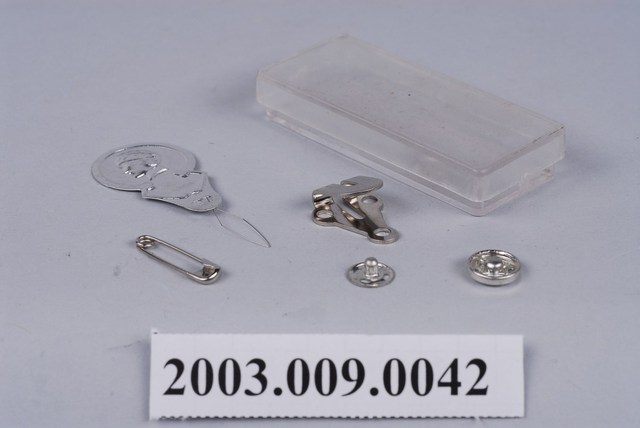 本物件為針線透明收納盒組件,內有鈕扣一對、穿線器及別針兩個。
