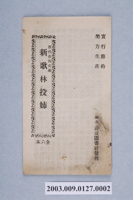 新歌林投姐講述的為清代府城三大奇案之一林投姐的傳說故事,故事訴說寡婦李昭娘在丈夫過世後再與丈夫好友周阿司結婚,結果周阿司只是為了錢財接近她,周阿司再取得她的財產後便轉賣樟腦獲取暴利並拋棄李昭娘回到原籍並另取新妻,而等不到周阿司回來的李昭娘在金錢用盡,孩子相繼凍死後於一個雨夜掐死最後一名幼子並於林投樹下上吊自殺。後來在府城便有女鬼作祟消息傳出,當地人為求安寧便建廟尊其為「林投姐」。而後有個由潮汕來的算命先生因為躲雨的緣故而進廟,李昭娘的冤魂便顯現出來求算命先生能讓她復仇,於是算命先生便刻了個神主使她的冤魂能付在上面且可以在雨傘下度過台灣海峽,而當李昭娘渡過黑水溝後便找到周阿司,成功地完成了她的復仇。體裁上屬於使用最多的七字一句,語言形式是使用閩南語。歌仔冊的由來是將傳統台灣戲曲藝術中的的「唸歌」以文字集結成冊印刷的出版品。