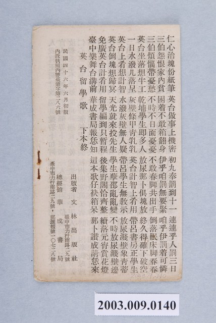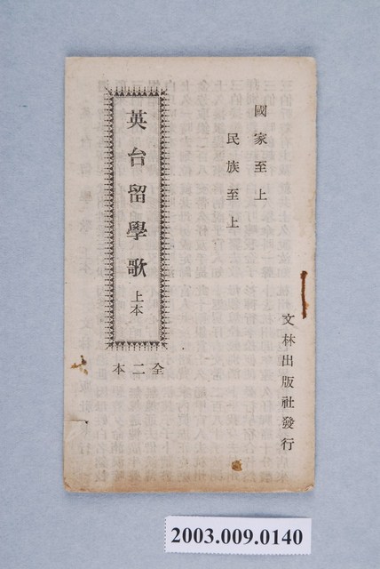 英台留學歌的內容取自中國民間四大傳說之一的梁山伯與祝英台,內容為浙江女子祝英台女扮男裝至杭州讀書,在其中遇上了梁山伯,兩人在學習的過程中感情日漸深厚,但是梁山伯卻不知道祝英台為女兒身。後來祝英台中斷學業返家,梁山伯到祝英台家拜訪才知道真相,於是欲向祝英台提親,才發現她早已被許配給馬文才,最後梁山伯抑鬱而死。後來當祝英台出嫁時途經梁山伯墳墓,祝英台前往祭拜,這時梁山伯的墓突然裂開,祝英台跳入其中,飛出一對彩蝶離去。體裁上屬於使用最多的七字一句,語言形式是使用閩南語。歌仔冊的由來是將傳統台灣戲曲藝術中的的「唸歌」以文字集結成冊印刷的出版品。