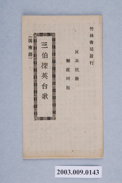 三伯探英台歌的內容取自中國民間四大傳說之一的梁山伯與祝英台,內容為浙江女子祝英台女扮男裝至杭州讀書,在其中遇上了梁山伯,兩人在學習的過程中感情日漸深厚,但是梁山伯卻不知道祝英台為女兒身。後來祝英台中斷學業返家,梁山伯到祝英台家拜訪才知道真相,於是欲向祝英台提親,才發現她早已被許配給馬文才,最後梁山伯抑鬱而死。後來當祝英台出嫁時途經梁山伯墳墓,祝英台前往祭拜,這時梁山伯的墓突然裂開,祝英台跳入其中,飛出一對彩蝶離去。體裁上屬於使用最多的七字一句,語言形式是使用閩南語。歌仔冊的由來是將傳統台灣戲曲藝術中的的「唸歌」以文字集結成冊印刷的出版品。竹林書局,現為竹林印書局。為一間台灣新竹的書店,除了一般書籍經營外也有五術書籍用品的販售。