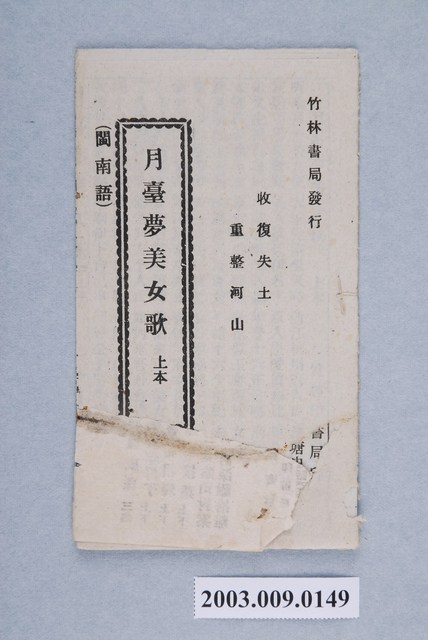月臺夢美女歌講述史家遭受奸人陷害,在外遊學的史家兒子史文被誣陷搶劫皇帝寶劍,後被抓捕準備處斬,幸得龍王製造水災相救,後史文被郭府的人救下,而在郭府期間與郭府女兒蘭英互有好感,最後史文努力讀書考取功名,成功見到皇帝洗刷冤屈。語言形式是使用閩南語。歌仔冊的由來是將傳統台灣戲曲藝術中的的「唸歌」以文字集結成冊印刷的出版品。竹林書局,現為竹林印書局。為一間台灣新竹的書店,除了一般書籍經營外也有五術書籍用品的販售。