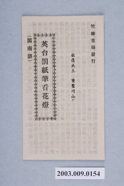 英台罰紙筆看花燈的內容取自中國民間四大傳說之一的梁山伯與祝英台,內容為浙江女子祝英台女扮男裝至杭州讀書,在其中遇上了梁山伯,兩人在學習的過程中感情日漸深厚,但是梁山伯卻不知道祝英台為女兒身。後來祝英台中斷學業返家,梁山伯到祝英台家拜訪才知道真相,於是欲向祝英台提親,才發現她早已被許配給馬文才,最後梁山伯抑鬱而死。後來當祝英台出嫁時途經梁山伯墳墓,祝英台前往祭拜,這時梁山伯的墓突然裂開,祝英台跳入其中,飛出一對彩蝶離去。體裁上屬於使用最多的七字一句,語言形式是使用閩南語。歌仔冊的由來是將傳統台灣戲曲藝術中的的「唸歌」以文字集結成冊印刷的出版品。竹林書局,現為竹林印書局。為一間台灣新竹的書店,除了一般書籍經營外也有五術書籍用品的販售。