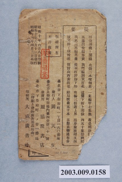 周協隆書店出版《特編胭花女配夫歌》上集