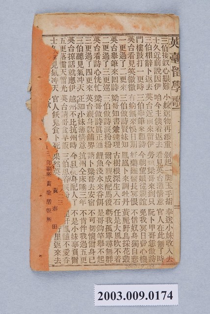 英台留學歌的內容取自中國民間四大傳說之一的梁山伯與祝英台,內容為浙江女子祝英台女扮男裝至杭州讀書,在其中遇上了梁山伯,兩人在學習的過程中感情日漸深厚,但是梁山伯卻不知道祝英台為女兒身。後來祝英台中斷學業返家,梁山伯到祝英台家拜訪才知道真相,於是欲向祝英台提親,才發現她早已被許配給馬文才,最後梁山伯抑鬱而死。後來當祝英台出嫁時途經梁山伯墳墓,祝英台前往祭拜,這時梁山伯的墓突然裂開,祝英台跳入其中,飛出一對彩蝶離去。體裁上屬於使用最多的七字一句,語言形式是使用閩南語。歌仔冊的由來是將傳統台灣戲曲藝術中的的「唸歌」以文字集結成冊印刷的出版品。