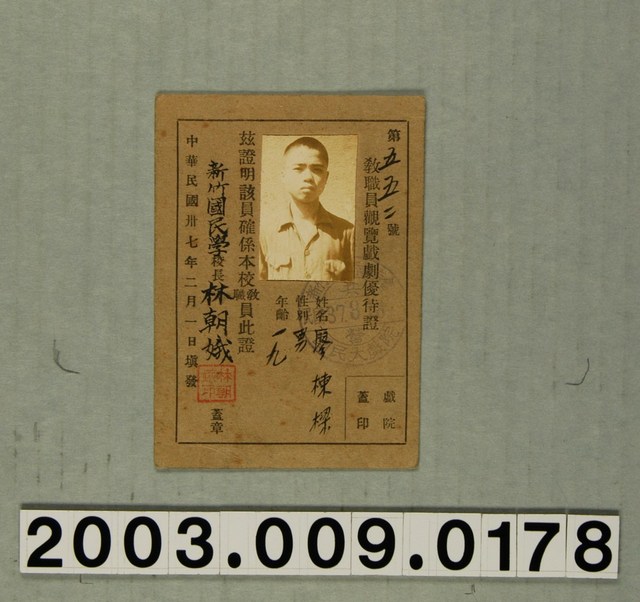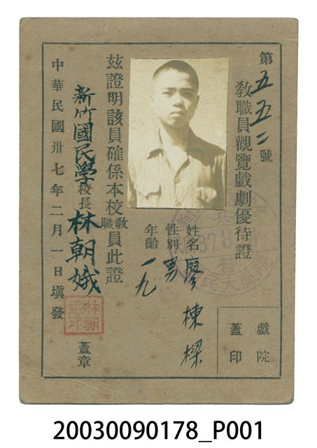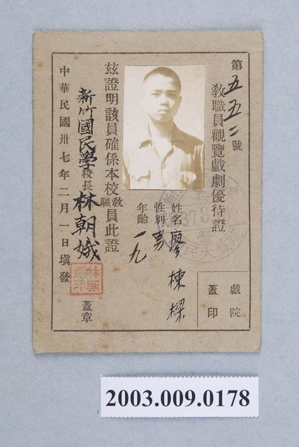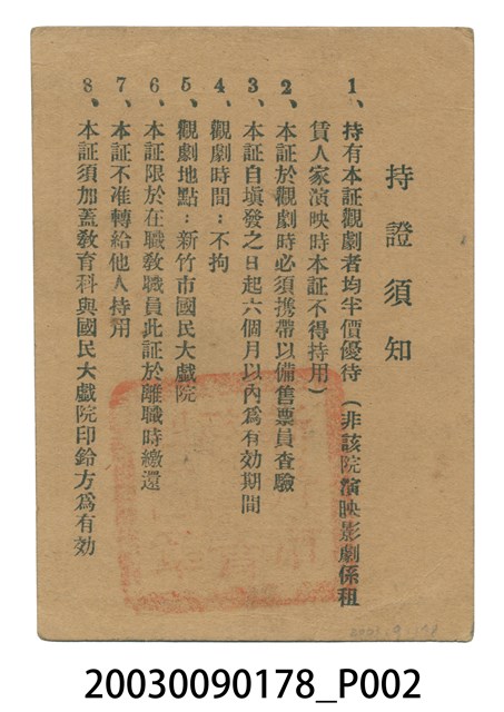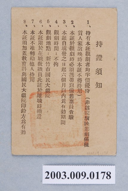 2003.009.0178 第五五二號教職員觀賞戲劇優待證