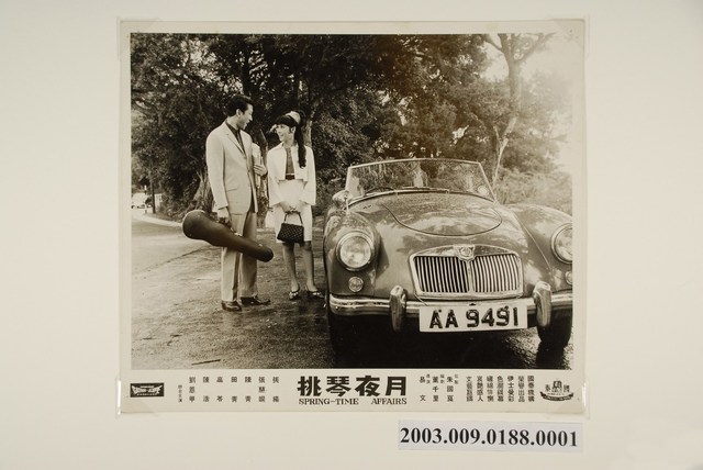 香港電影《月夜琴挑》在臺灣發行的黑白劇照,照片上為在室外的路邊,男女主角張揚及張慧嫻正站立在一臺標示MG(Morris Garages)的英國車旁,狀似正在聊天說笑貌。