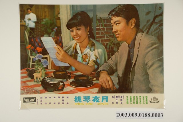 香港電影《月夜琴挑》在臺灣發行的彩色印刷劇照,由復興橡皮印刷公司承印,照片上為在室內的咖啡廳,左方坐著女主角張慧嫻正微笑閱讀手中的樂譜,而右側則是亦面帶微笑的男主角張揚。