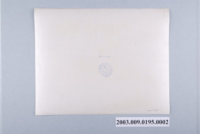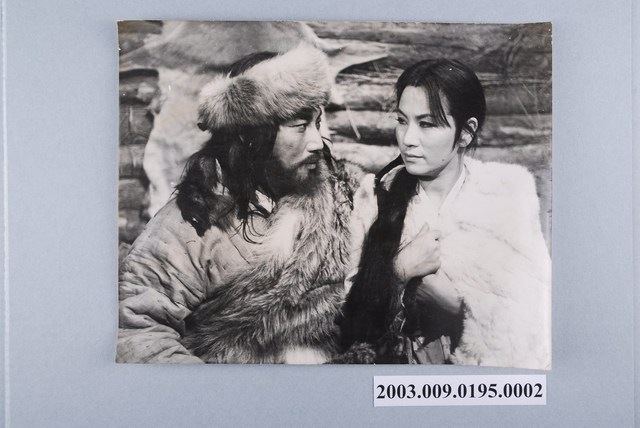 推測為《秘谷雙俠》黑白電影劇照,照片上為在室外的場景,一對古裝妝扮的男女正四目交對的模樣。背面則蓋印有「秘谷双俠」字樣,以及「聯成企業有限公司、台北市昆明街九十六巷十五號」圖章。