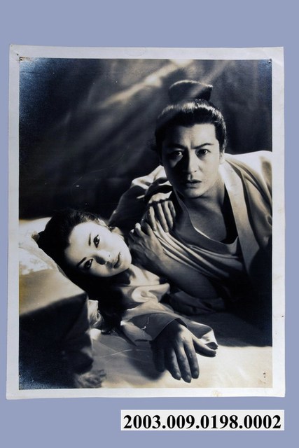 日本電影《白蛇傳》黑白劇照,照片上為在室內床席之上,左方為飾演白素貞的女主角李香蘭,而右方為飾演許仙的男主角池部良,兩人正躺臥在床面露訝異注視著鏡頭的模樣。