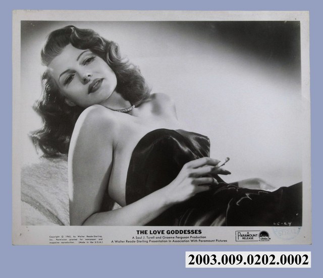 本件劇照上的女明星為麗泰海華斯(Rita Hayworth, 1918-1987),也是美國早期知名的性感女星。這張照片源於1946年好萊塢哥倫比亞公司出品的黑白片《Gilda》,麗泰海華斯在該部電影裡扮演賭場黑道大哥的女人,但當大哥死後,她再嫁給賭場裡的舊愛賭徒,為一能歌擅舞,充滿女性風情萬種的角色。