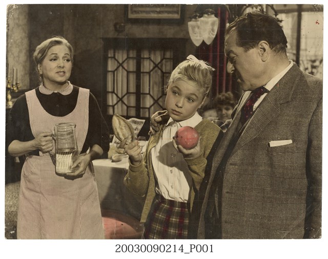 西班牙電影《不如歸續集》在臺灣發行的手繪上色劇照,照片上為室內客廳場景三人站立貌,左側為飾演女傭的西班牙女星伊莎貝葛瑞絲(Isabel Garcés),中間為西班牙小女主角瑪麗莎(Marisol),右方則應為飾演伯父雷蒙的José Marco Davó。