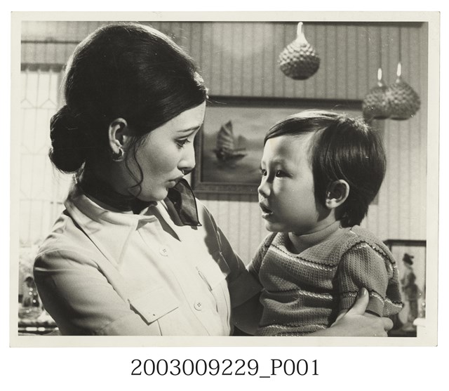 美國電影《蘇絲黃的世界》黑白橫式劇照。照片上的左方女子為飾演蘇絲黃的女主角關南施正抱著劇中私生兒子在懷中的模樣。