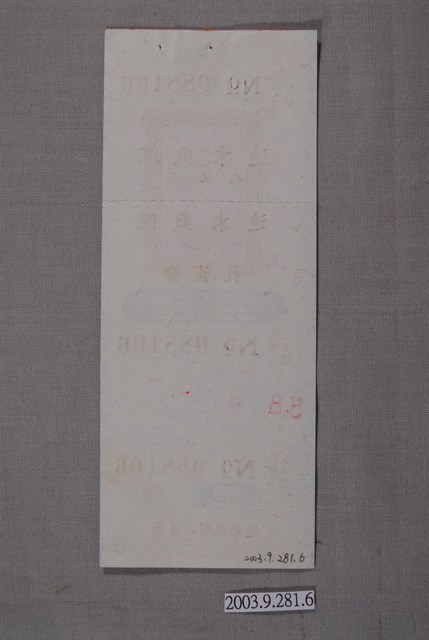 1.本物件為遠東戲院之票券,為紙質文物。該票券底色為白色,為全票。由上至下可見其票券編號為「NO 088106」,觀賞廳為「遠東戲院孔雀廳」、票券類別為「全票」,日期與場次為「58.3.5 第一場」。票券上方亦印有橘紅色之騎縫章。物件背面為空白頁面。