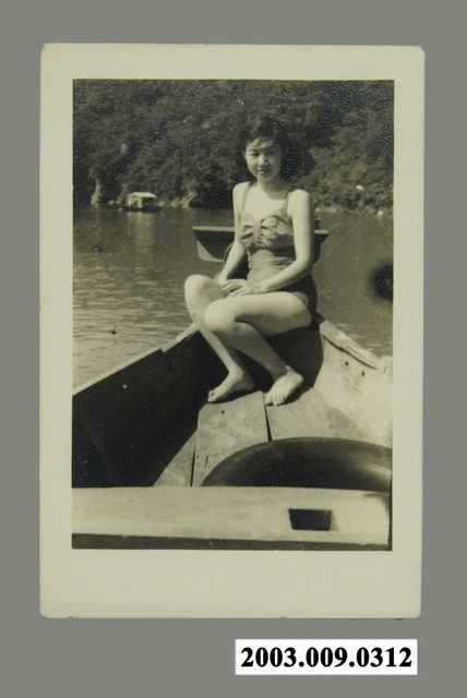 推測為日本電影劇照,片名不詳,照片上似為身著泳裝的日本女星若尾文子。 本件與館藏號2003.009.0311為同一場景、同一位女明星。