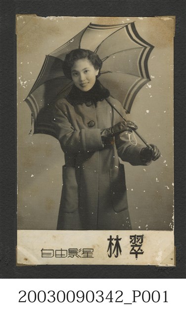 2.香港女明星林翠於自由影業期間的黑白時裝照,下方另有文字標示「自由影星林翠」印刷字樣。林翠(1936-1995),本名曾懿貞,出生於上海,1949年隨家人定居香港。林翠1953年考入由導演黃卓漢經營的自由影業,1954年以處女作《女兒心》大紅,成為台柱明星;1957年加盟香港電懋公司,開啟其電影事業的黃金期。代表作包括《馬車伕之戀》(1956)、《山地姑娘》(1956)、《馥蘭姐姐》(1956)、《蘭閨風雲》(1959)、《豆腐西施》(1959)、《啼笑姻緣》(1964)等。1970年代移居美國舊金山,1980年代復出影壇,參與電影《海峽兩岸》(1988)、《胭脂》(1991)以及臺灣電視劇《不了情》、《婆媳過招七十回》等演出,1995年氣喘發作病逝於臺北。
