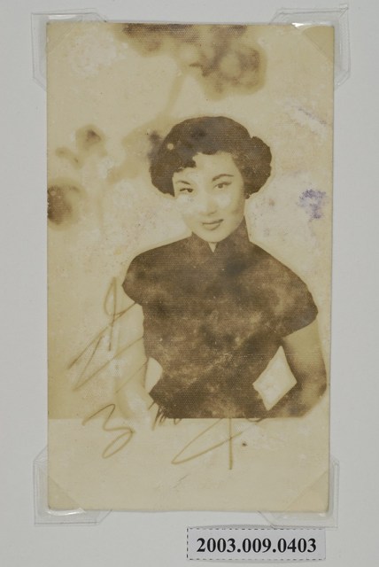 香港知名女星李麗華身著古典旗袍的黑白照,上有「李麗華」簽名字跡。