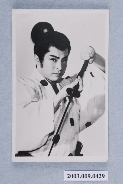 推測為日本男明星小林旭做武士打扮、雙手持刀的黑白照。