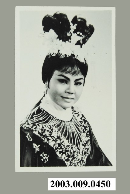 臺灣歌仔戲演員月春鶯扮小旦的黑白定裝照,其上有標示白色文字「月春鶯」之名。