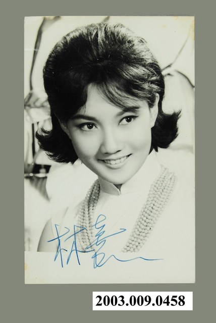 女明星林嘉的黑白時裝照,上有其簽名。 林嘉為1960年代香港邵氏電影公司力捧的女演員,出生於1947年,1964年加入邵氏成為基本演員,1966年與潘迎紫、何莉莉、胡燕妮等被邵氏捧為「新十二金釵」,代表作包括《龍虎溝》、《大盜歌王》、《碧海青天夜夜心》等。1970年代離開邵氏,並減少演出,1978年息影。