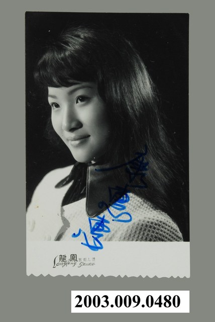 臺灣歌仔戲女演員康惠惠的黑白時裝明星照,上有「康惠惠」簽名字跡;而照片下方則有「龍鳳藝術人像」、「Longfeng Studio」等字樣。 康惠惠,即康銘惠(康明惠),臺灣歌仔戲演員,1977年加入小明明歌仔戲團,飾演小明明的娘子,後也成為黄香蓮歌仔戲團的主要演員之一,演出過的作品包括《洛陽橋》、《江南四才子》等。
