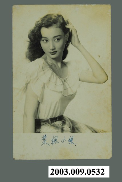 香港知名女星葉楓的黑白時裝照,上方為個人照,下方則有深藍色字跡撰寫「葉楓小姐」字樣。