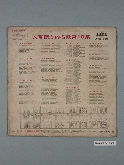 2003.009.0610.0001 亞洲唱片公司出品台語歌曲專輯《文夏懷念的名歌第10集:文夏的採檳榔》唱片封套