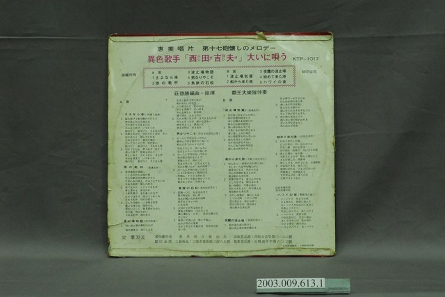 惠美唱片公司出品黃西田演唱日語歌曲專輯《金大豹第十七砲 懷念的旋律:異色歌手西田吉夫 大いに歌う》十吋塑膠唱片