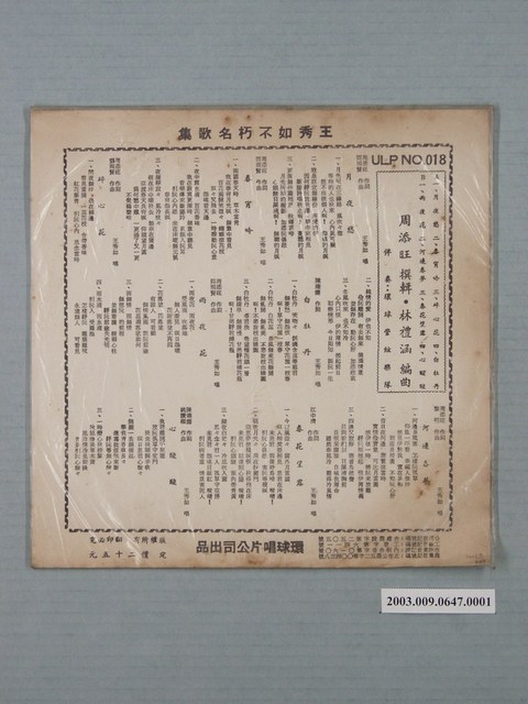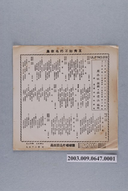 環球唱片公司出品臺語歌曲專輯《難忘的臺語名歌集:王秀如不朽名歌集》10吋塑膠唱片