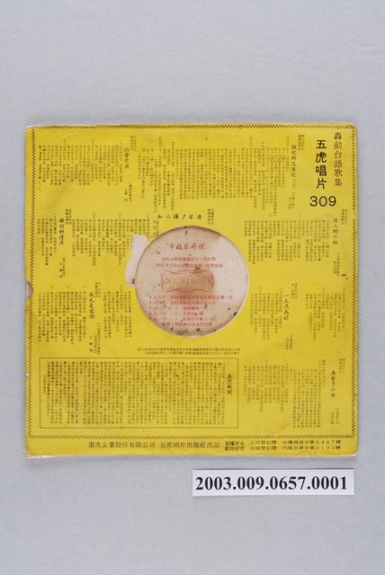 2003.009.0657.0001 五虎唱片公司出品編號「FT-309」臺語歌曲專輯《最新臺語轟動歌曲》唱片封套