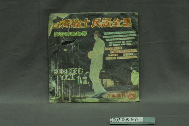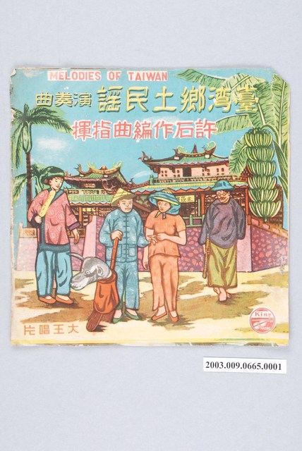 許石大王唱片出品專屬封套,正面為許石演出照片套色印刷,標題為「臺灣鄉土民謠全集:許石 編曲指揮」,註明為1962年1月10日臺北市政府主辦的「臺灣鄉土民謠歌舞表演會」影像。背面為牛犁歌及鄉土影像為主題的圖版拼貼彩色圖案,圖版內容包括香蕉樹、牛犁歌、採茶戲丑角、赤崁樓等圖案,標題為「臺灣鄉土民謠演奏曲」。