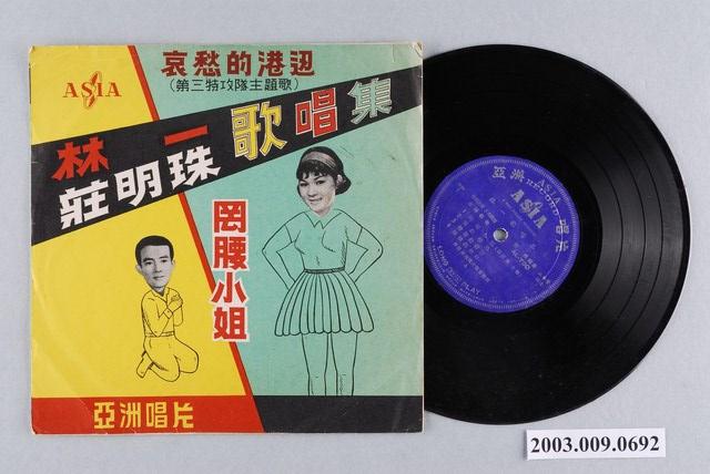 「亞洲唱片公司」出品編號「AL-730」的十吋塑膠唱片,雲萍編曲,主題為「林一、莊明珠歌唱集:罔腰小姐」,封面宣傳歌曲為「哀愁的港邊:第三特攻隊主題歌」。
