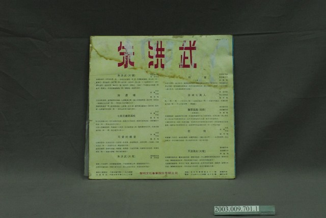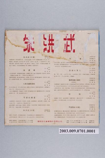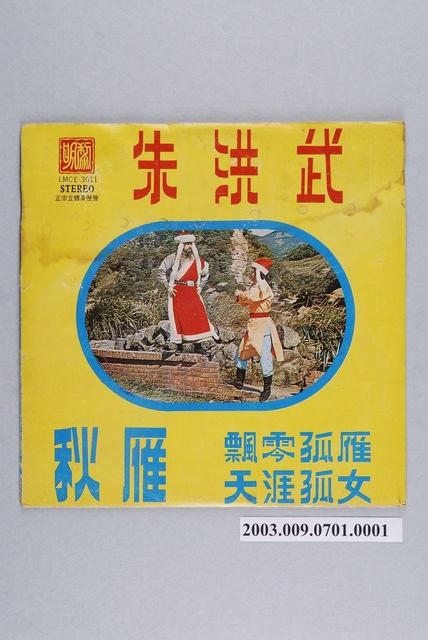 黎明文化事業出版,12吋塑膠立體聲錄音唱片,標題為「臺語歌星唱片選」,主打歌曲為1971年臺視撥出臺語連續劇「朱洪武」主題曲,作曲為當時在臺視擔任特約作曲的曾仲影。內容歌曲包括〈秋雁〉、〈飄零孤雁〉、〈天涯孤女〉等歌曲。本藏品僅存唱片封套。