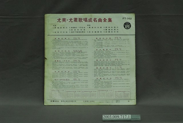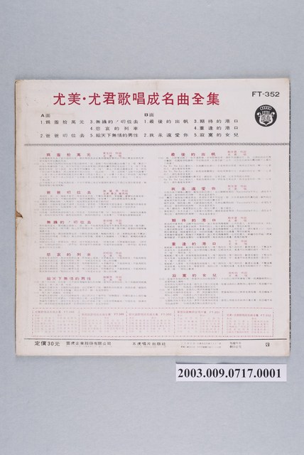 五虎唱片公司出品編號「FT-352」尤美主唱臺語歌曲專輯《尤美、尤君歌唱成名曲全集:為著拾萬元》12吋塑膠唱片
