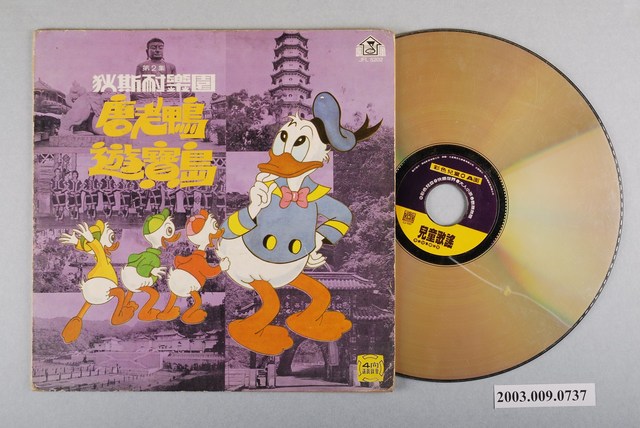 唱片封套與內容不符。 封套:家風唱片公司出品編號「JFL-5202」民謠改編童謠歌曲專輯《狄斯耐樂園第二集:唐老鴨遊寶島》唱片封套,為館藏號2003.009.0732之唱片封套。 唱片:曜新穎公司發行《兒童歌謠:快樂兒童排排坐》唱片,白金光碟片。其唱片封套為館藏號2003.009.0747 。