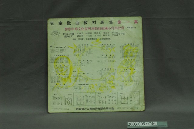 「鈴鈴唱片」出品編號「RR-6052」唱片封套,內容為「兒童歌曲專集(低年級)」,封套正面註明為國民小學標準教材第一集,背面註明為響應中華文化復興運動加強國小育樂教育,收錄有〈唱出一個春天來〉、〈只要我長大〉、〈向前走〉等國語童謠十四首,「正東兒童合唱團」演唱,1971年4月出版。其唱盤為館藏號2003.009.0743.0002。