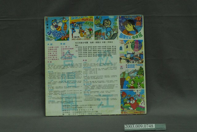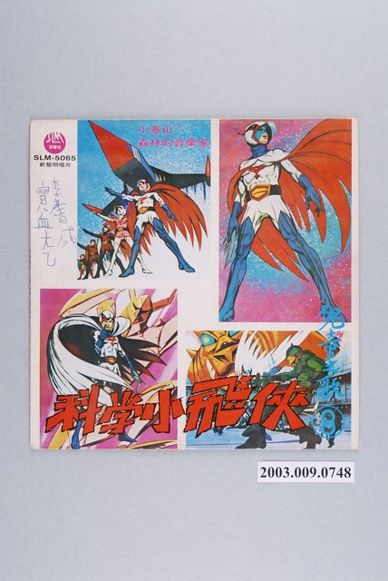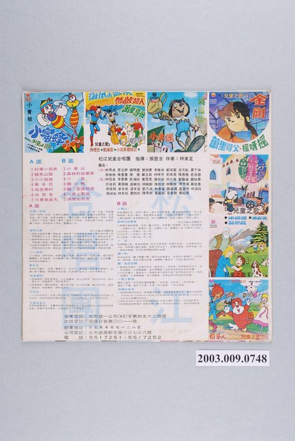 「新黎明唱片」出品編號「SLM-5065」唱片封套,松江合唱團演唱,內容為「小泰山」,收錄〈小泰山〉、〈森林的音樂家〉、〈小鳥〉、〈科學小飛俠〉等國語童歌及卡通歌曲,1978年1月出版。其唱片為館藏號2003.009.0733。