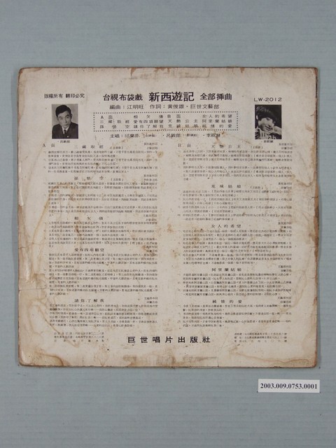 2003.009.0753.0001 巨世唱片公司出品編號「LW-2012」臺語歌曲專輯《台視布袋戲新西遊記全部插曲》唱片封套