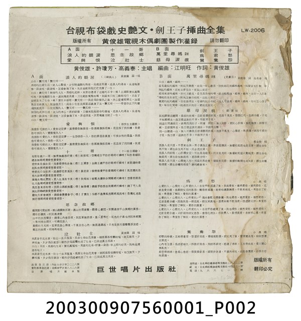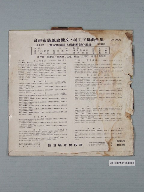 2003.009.0756.0001 巨世唱片公司出品編號「LW-2006」臺語歌曲專輯《史艷文插曲全集》唱片封套