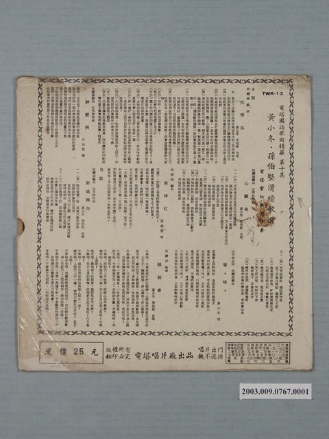 電塔唱片公司出品編號「TWK-13」國語歌曲專輯《電塔國語歌曲精華第十集:黃小冬、孫伯堅滑稽歌選》10吋塑膠唱片