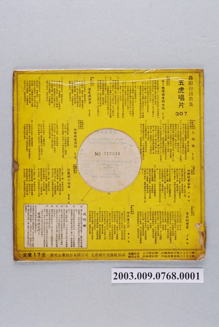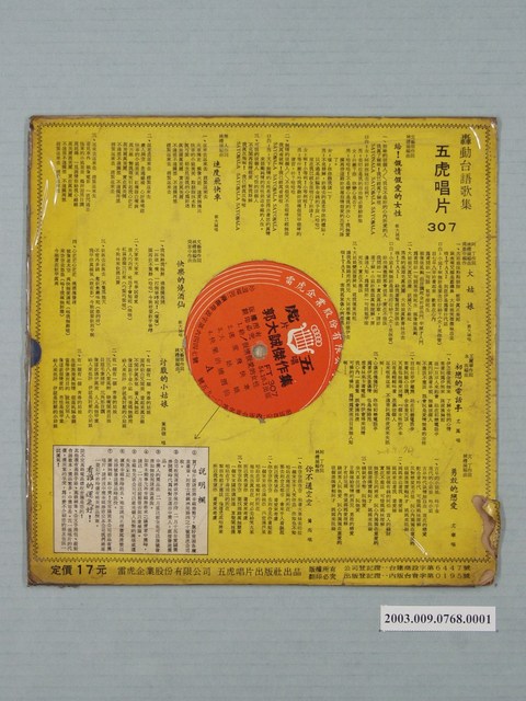 五虎唱片公司出品編號「FT-307」臺語歌曲專輯《台語轟動歌集:郭大誠主唱》10吋塑膠唱片