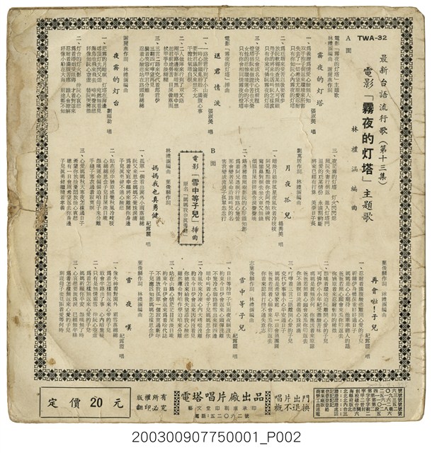 2003.009.0775.0001 電塔唱片公司出品編號「TWA-32」臺語歌曲專輯《最新臺語流行歌第十三集:電影霧夜的燈塔插曲》唱片封套