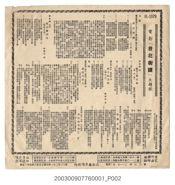 2003.009.0776 鈴鈴唱片公司出品編號「FL-1079」臺語電影《台北街頭主題歌》