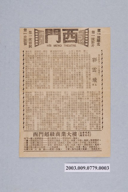 「彩雲飛」是1973年上映的國語電影,被文化局選為優良電影,李行導演、瓊瑤小說改編,甄珍、鄧光榮主演,是早期瓊瑤電影的代表作。 所謂「本事」為簡單印刷的電影故事介紹,由影院提供購票觀眾留作紀念,70年代臺灣影院提供的本事多半為尺寸18.7cm*26.2cm、一張兩面的印刷品。本件由臺北市西門町的西門戲院印製發放。 本件與館藏號2003.009.0779.0004為相同複件。