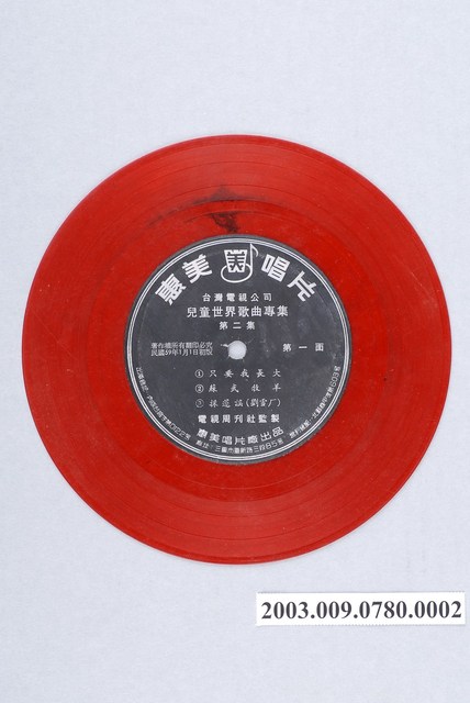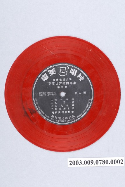 惠美唱片公司出品的七吋半透明塑膠唱片兩張,《台灣電視公司兒童世界歌曲專集第二集》第一面至第四面,電視週刊社監製,民國59(1970)年1月1日出版,共十四首兒歌。包括〈只要我長大〉、〈蘇武牧羊〉、〈西風的話〉、〈愛跳舞的小朋友快來跳〉、〈每事問〉、〈小鬧鐘〉等歌曲。本唱片為電視週刊雜誌社發行,委託惠美唱片製作。