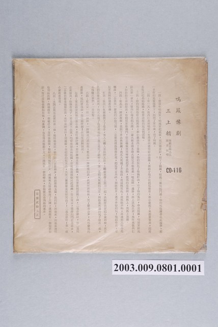 封套為鳴鳳唱片公司出品編號「CO-116」豫劇專輯《三上轎》,豫劇當家名旦陳素真演唱。封套背面附有全劇唱詞內容,註明定價20元。民國52年1月15日再版。