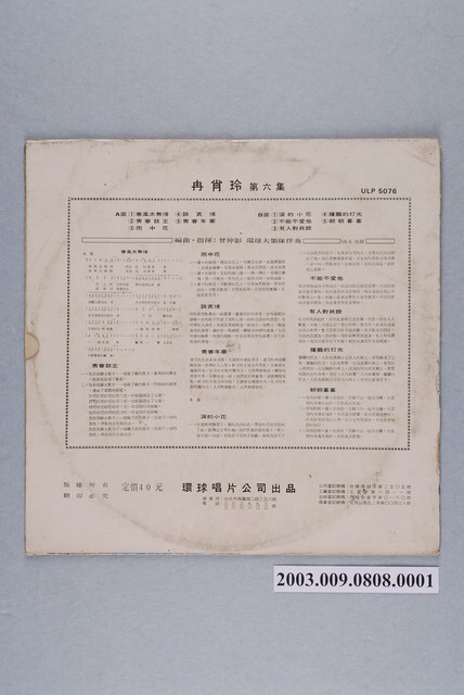 環球唱片公司出品編號「ULP-5076」國語流行歌曲專輯《冉肖玲第六集:春風太無情》唱片封套